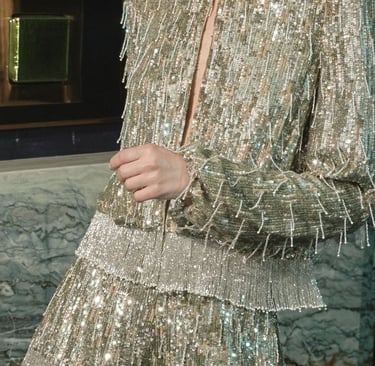 The beauty of modern sequins lies in their balance. They no longer exist to announce arrival, but to complement it. The fabrics are softer, the cuts cleaner, the palette quieter — metallics that feel like moonlight rather than strobe light.